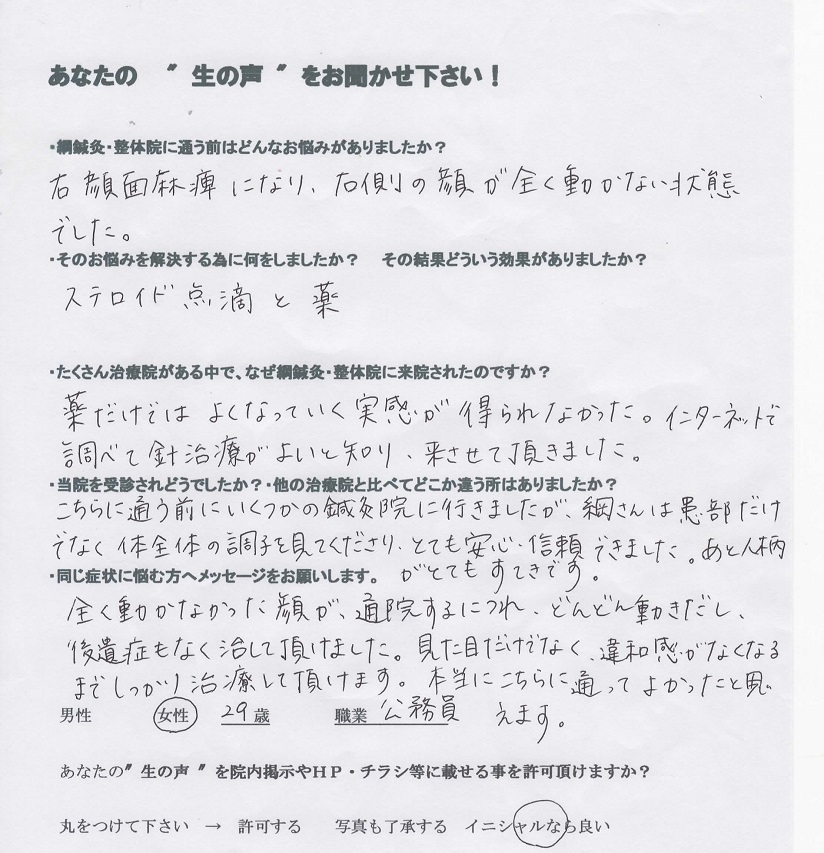 全く動かなかった顔が、通院するにつれて、どんどん動きだし、後遺症もなく治して頂けました。